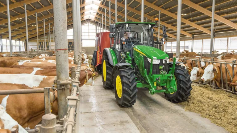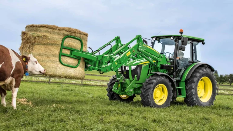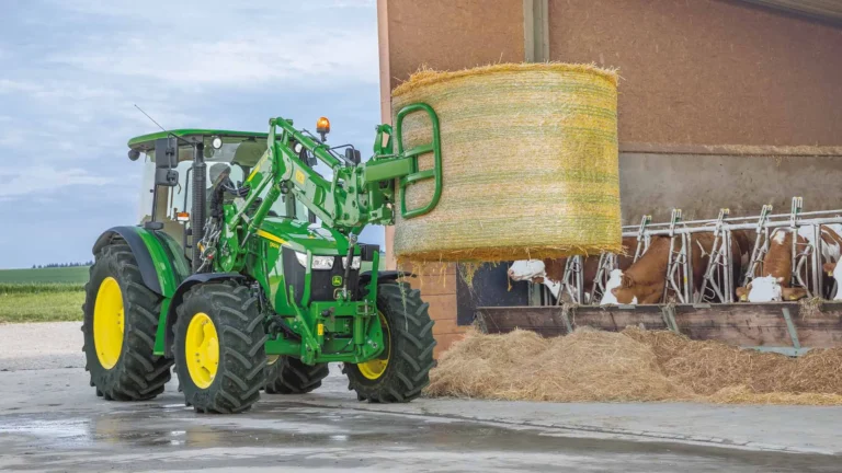 Kabina ciągnika John Deere 5100M została zaprojektowana z myślą o maksymalnej widoczności i komforcie operatora. Pionowo poprowadzona rura wydechowa umieszczona obok słupka kabiny minimalizuje przeszkody w polu widzenia, co jest szczególnie istotne podczas precyzyjnych prac polowych i transportowych. Dodatkowo, przestronna i klimatyzowana kabina wyposażona jest w ergonomiczne elementy sterowania, co zwiększa komfort pracy operatora nawet podczas długotrwałych zadań.
