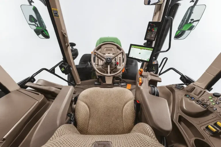 John Deere stawia na pełnoramową konstrukcję, która zapewnia wyjątkową wytrzymałość i odporność na intensywne obciążenia. Solidna rama efektywnie rozprasza siły działające podczas pracy z ciężkim osprzętem, takim jak ładowacze czołowe, a także tłumi drgania wynikające z nierówności terenu. Dzięki temu ciągnik oferuje maksymalną stabilność i niezawodność, gwarantując płynną i efektywną pracę nawet w najtrudniejszych warunkach.
