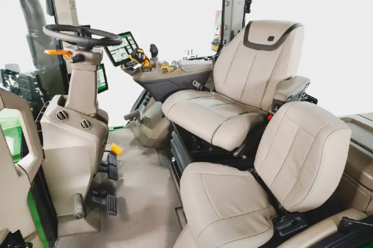 Przestronna kabina została zaprojektowana z myślą o maksymalnym komforcie i ergonomii, zapewniając doskonałe warunki do wielogodzinnej pracy. Zaawansowane zawieszenie sterowane elektronicznie skutecznie tłumi drgania, a fotel ActiveSeat™ II z dynamiczną amortyzacją i funkcją masażu podnosi wygodę operatora na zupełnie nowy poziom. Dodatkową przestrzeń i swobodę zapewniają trzy podnóżki, a wyjątkowe wrażenia akustyczne gwarantuje immersyjny system dźwiękowy 6.1.